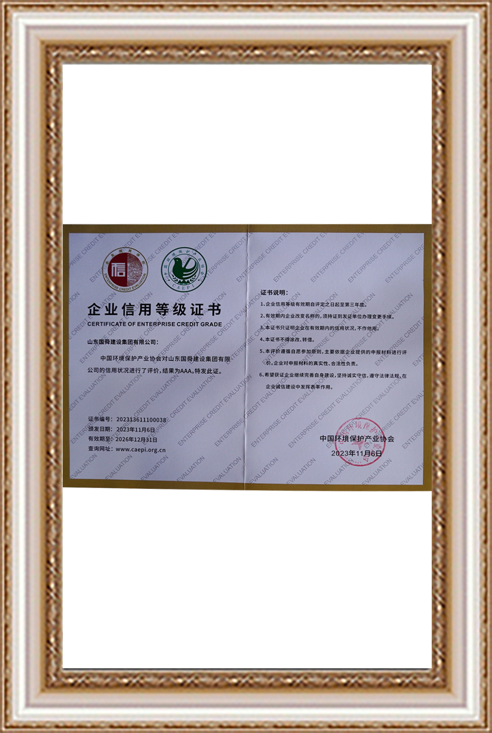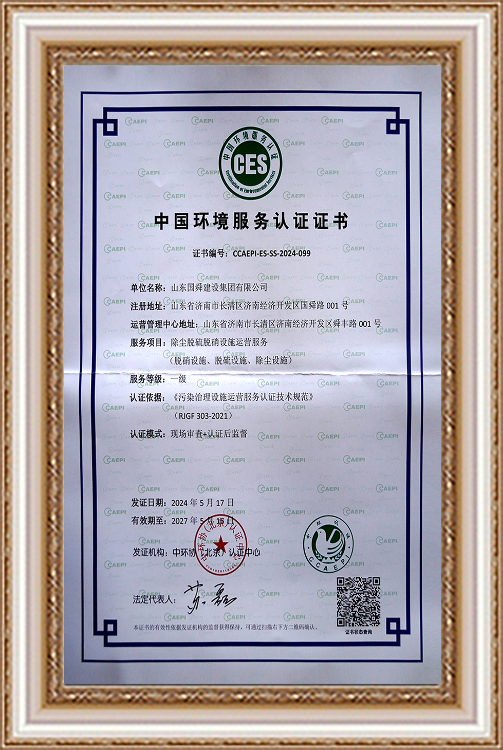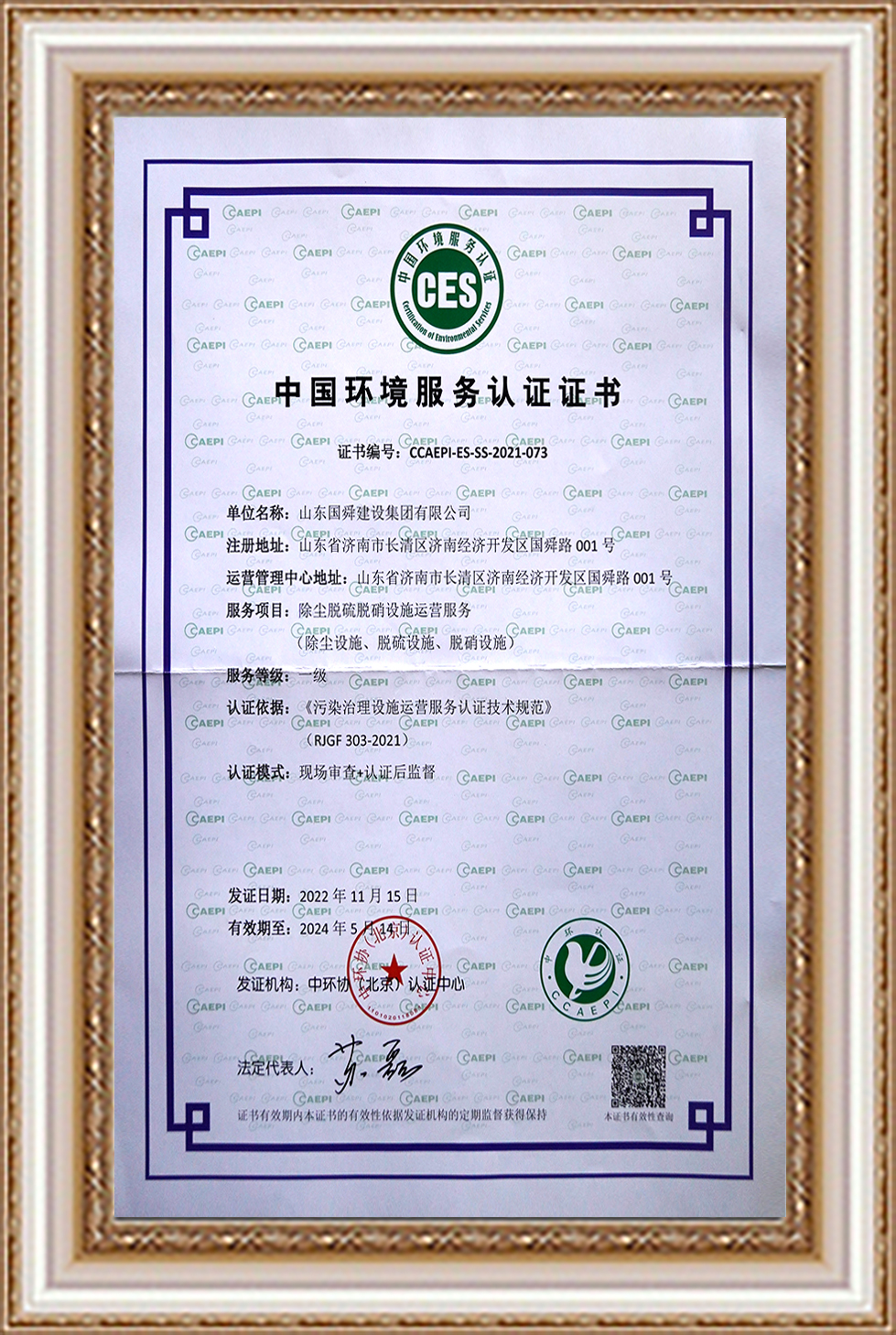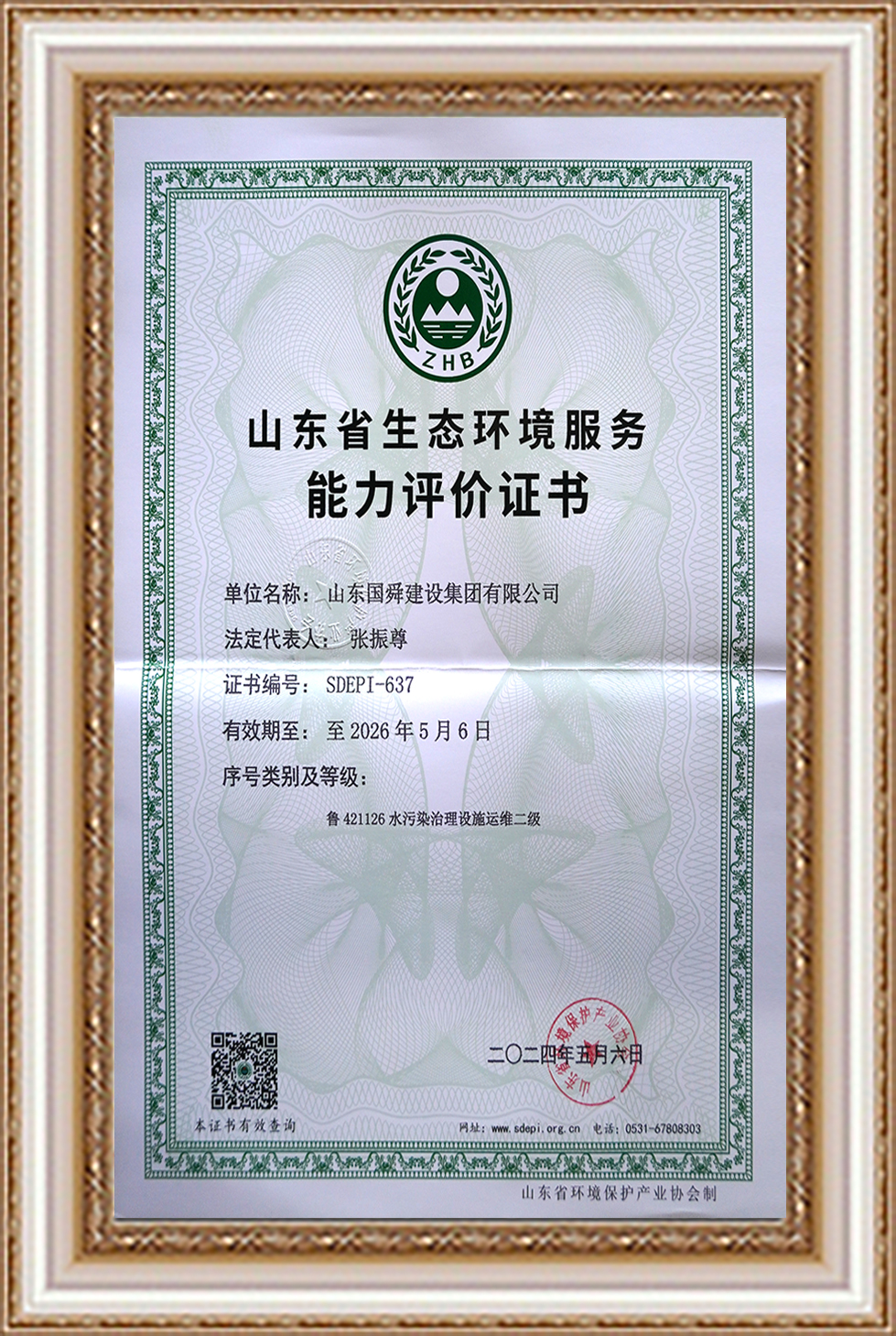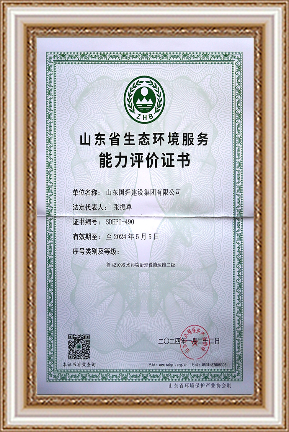 山東省生態(tài)環(huán)境服務(wù)能力評(píng)價(jià)證書