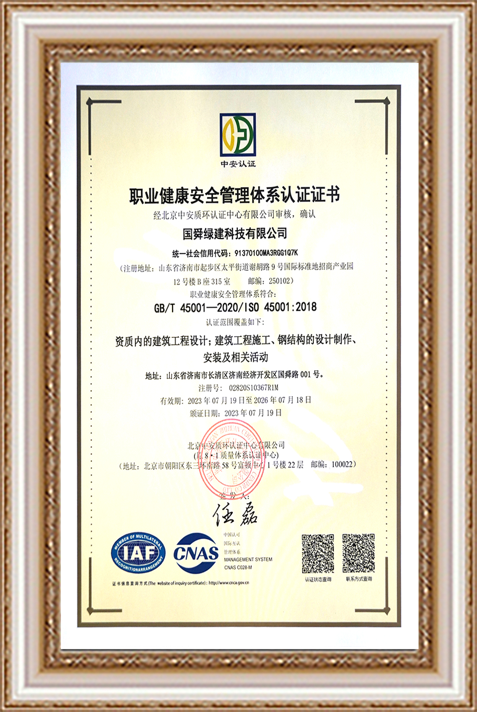 職業(yè)健康安全管理體系認(rèn)證證書