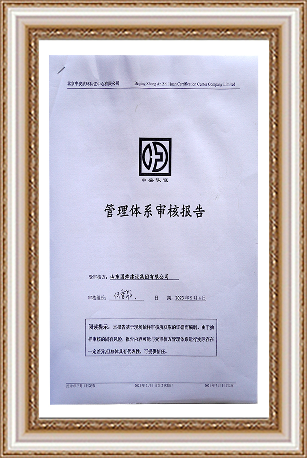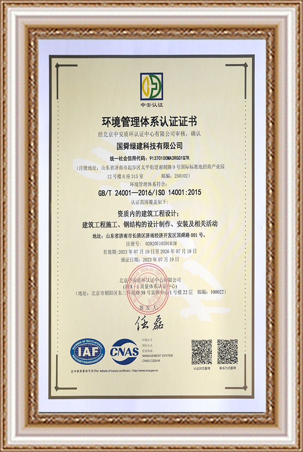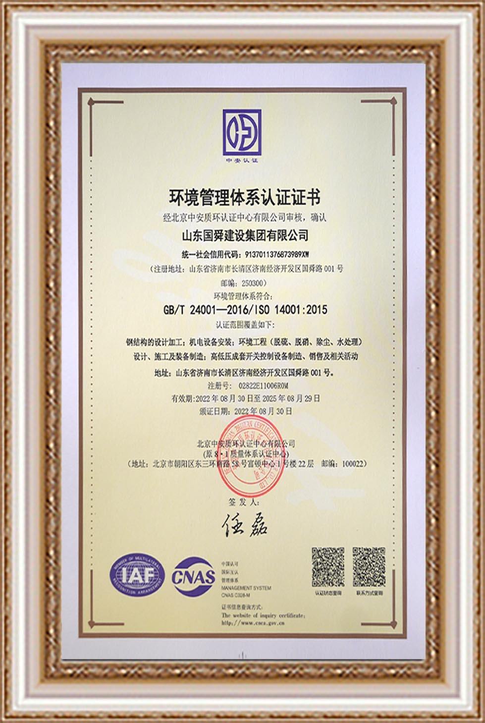 環(huán)境管理體系認(rèn)證證書