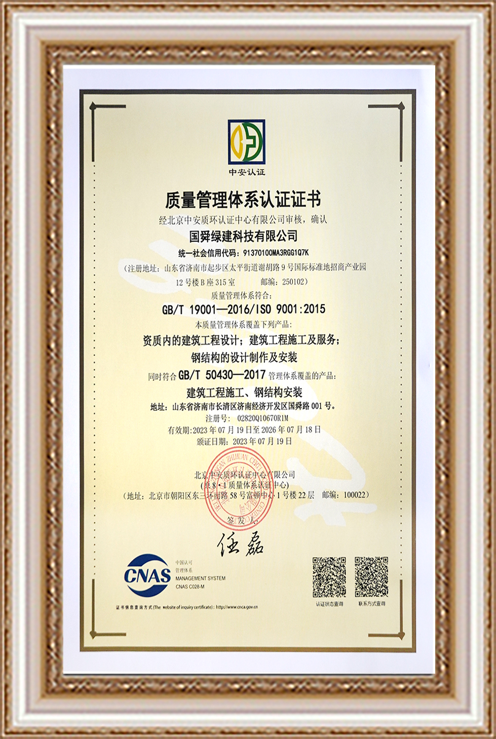 質(zhì)量管理體系認(rèn)證證書