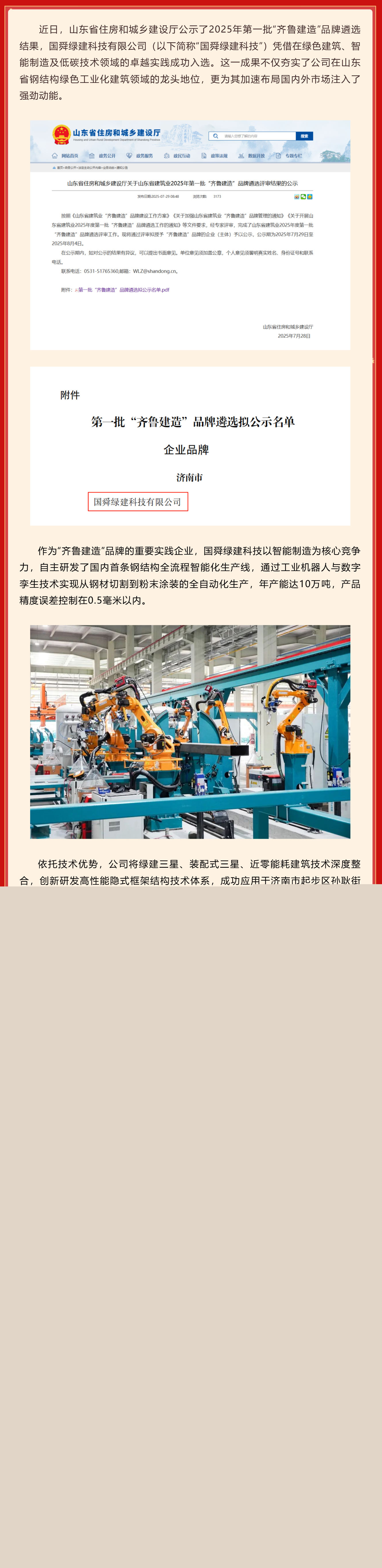 頭條 | 喜報(bào)!以綠色智造引領(lǐng)建筑工業(yè)化新范式——國舜綠建科技有限公司榮膺山東省建筑業(yè)2025年首批“齊魯建造 ”品牌 !