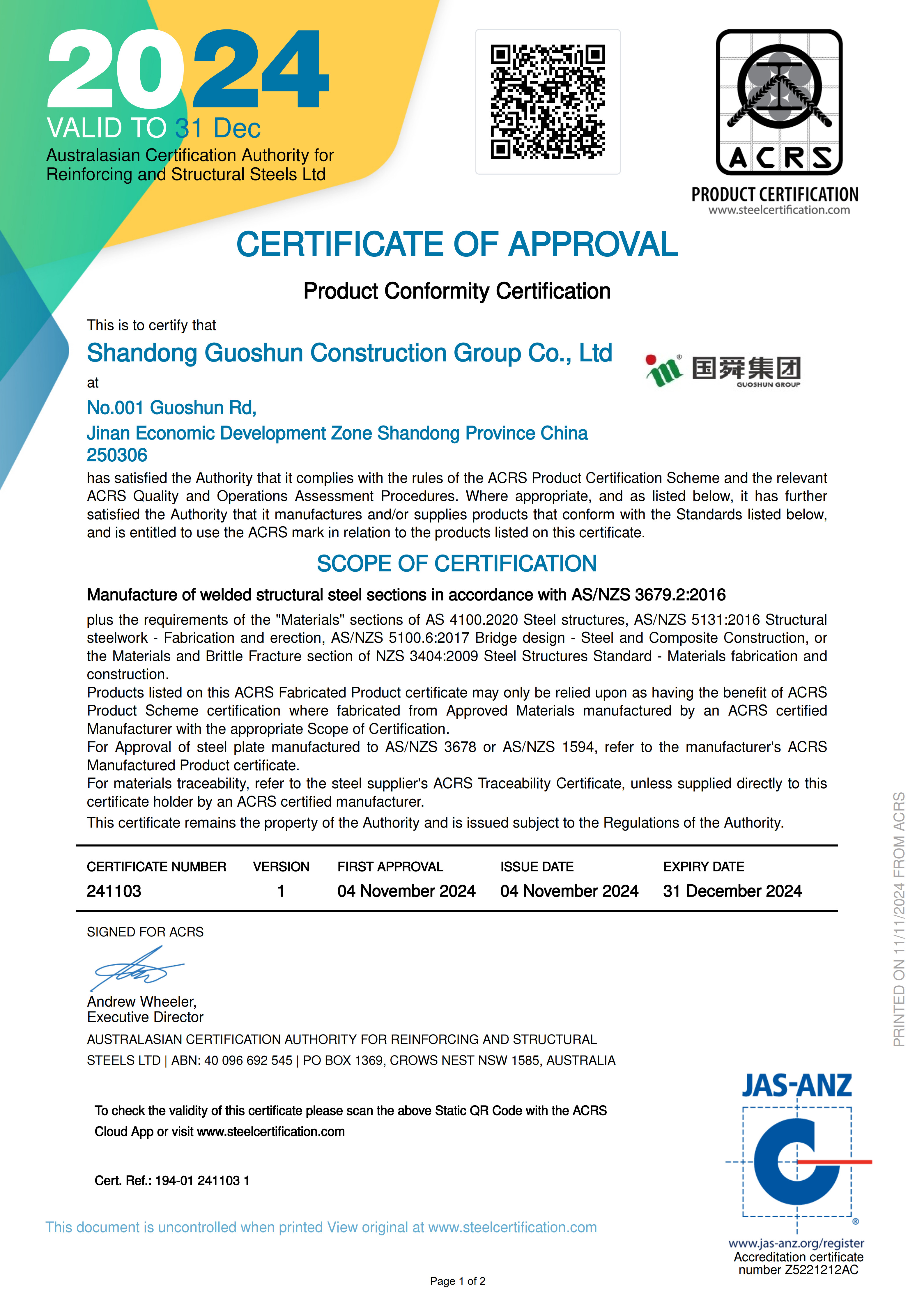 ACRS(Australasian Certification Authority for Reinforcing Steels,澳大利亞與新西蘭鋼筋和結(jié)構(gòu)鋼認(rèn)證機構(gòu))認(rèn)證,是澳大利亞和新西蘭建筑及基礎(chǔ)設(shè)施行業(yè)對鋼材產(chǎn)品質(zhì)量的權(quán)威認(rèn)證,對于鋼材的化學(xué)成分、力學(xué)性能、尺寸公差、冶金結(jié)構(gòu)、焊接工藝以及表面處理等均有嚴(yán)格的規(guī)定。作為首家通過ACRS 3679.2認(rèn)證的中國企業(yè),國舜集團生產(chǎn)的焊接H型鋼產(chǎn)品完全符合AS/NZS 3679.2:2016標(biāo)準(zhǔn),可以滿足澳大利亞和新西蘭市場對鋼材質(zhì)量的嚴(yán)格要求,產(chǎn)品質(zhì)量已達到國際領(lǐng)先水平。