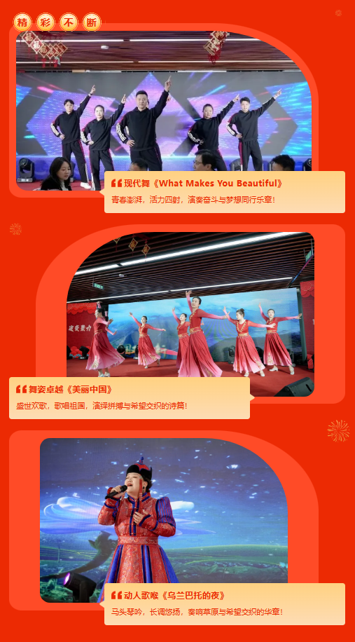 會(huì)議結(jié)束后,集團(tuán)舉行了聯(lián)歡晚會(huì)。各子分公司自編自導(dǎo)的精彩文藝節(jié)目輪番上演,展現(xiàn)出了集團(tuán)公司員工昂揚(yáng)奮進(jìn)的精氣神。精彩的演出激勵(lì)全員團(tuán)結(jié)一心、并肩攜手、迎難而上,為實(shí)現(xiàn)全年目標(biāo)任務(wù)不懈奮斗!